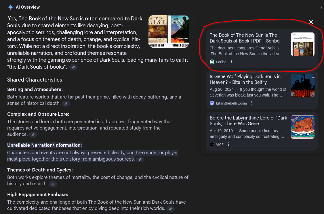 My most popular essay is about The Book of the New Sun and Dark Souls. If you searched for The Book of the New Sun it would show up relatively high (even hitting the front page in the image search). But now, if you search for links between The Book of the New Sun and Dark Souls (or even just religion, for that matter), you get a smorgasbord of AI generated answers ripped from a dozen different sources. And my contributions are either not cited or squirreled away in a footnote that no one will click on.